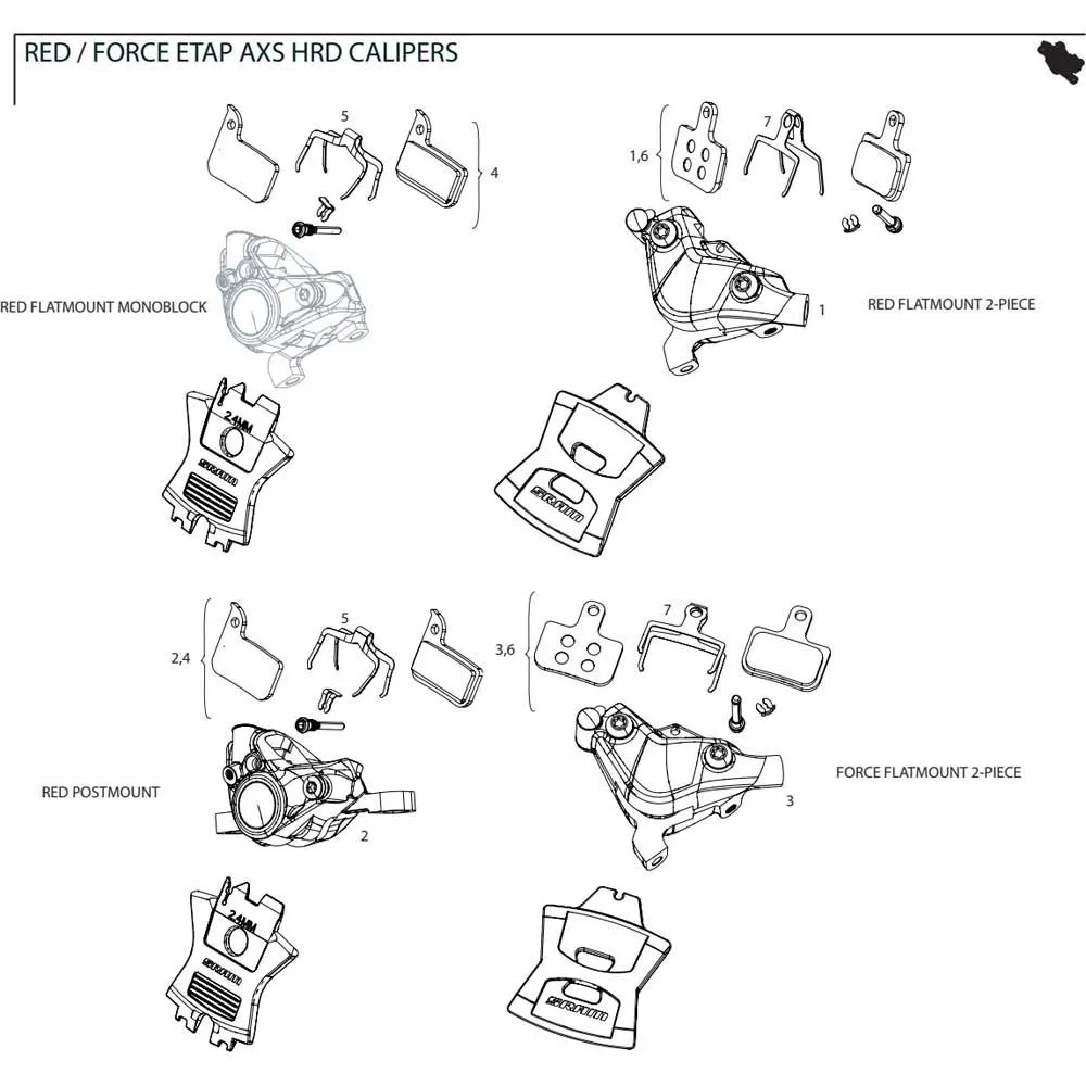 DISC BRAKE CALIPER ASSEMBLY RED ETAP AXS D1 HRD FLAT MOUNT: 1 BRAKE CALIPER FRONT/REAR POLAR GREY, INCLUDING BRAKE PADS